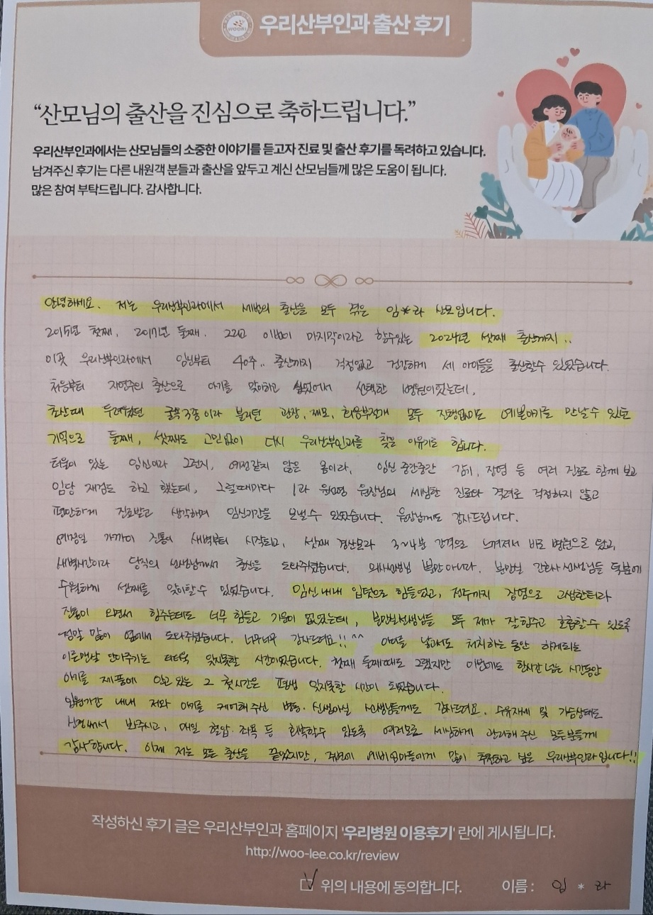 안녕하세요. 저는 우리산부인과에서 세번의 출산을 모두 겪은 임*라 산모입니다.