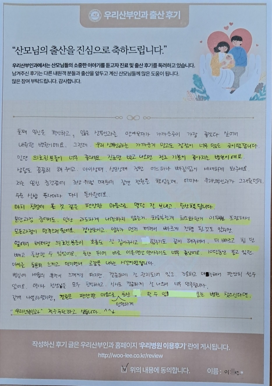 길게나열하였지만, 결론은 편안한 마음으로 안전하게 출산 할 수 있는 병원을 찾으신다면 우리산부인과를 적극추천하고 싶습니다.