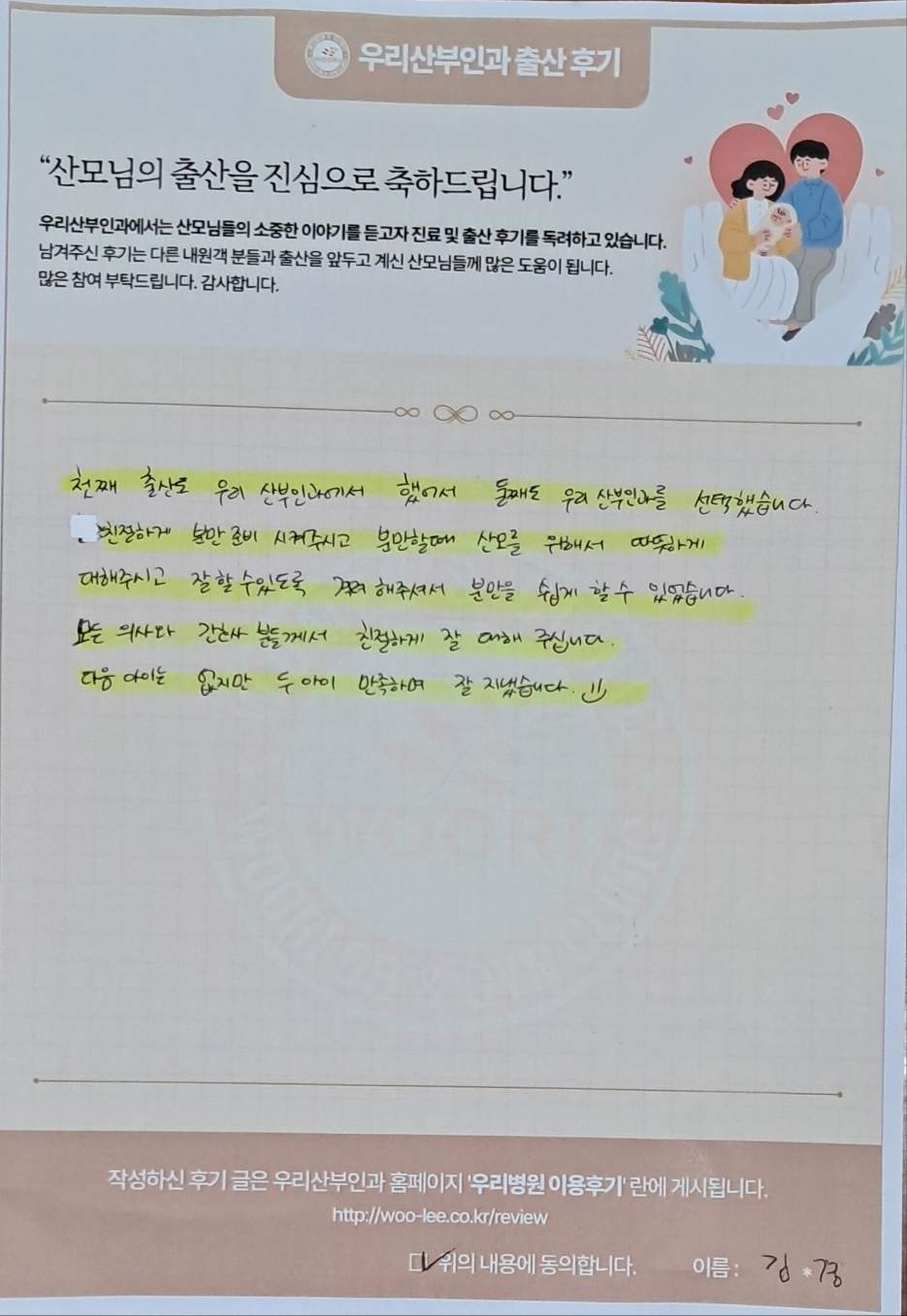 첫째 출산을 우리산부인과에서 했어서 둘째도 우리산부인과를 선택했습니다.