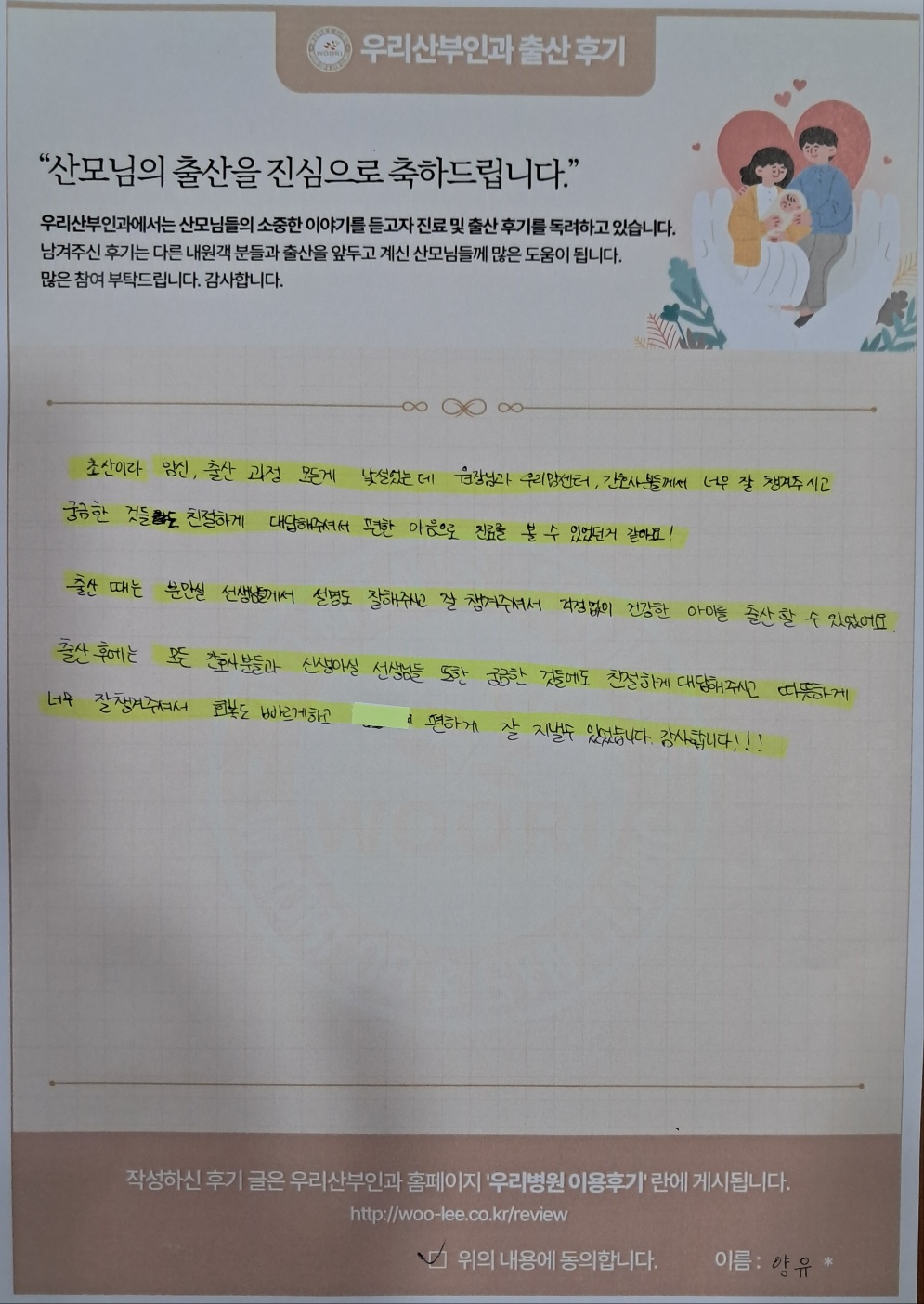 초산이라 임신, 출산 과정에 모든게 낯설었는데 원장님과 우리맘센터, 간호사분들께 너무 잘 챙겨주시고 궁금한 것들도 친절하게 대답해주셔서 편한 마음으로 진료를 볼 수 있었던거 같아요!