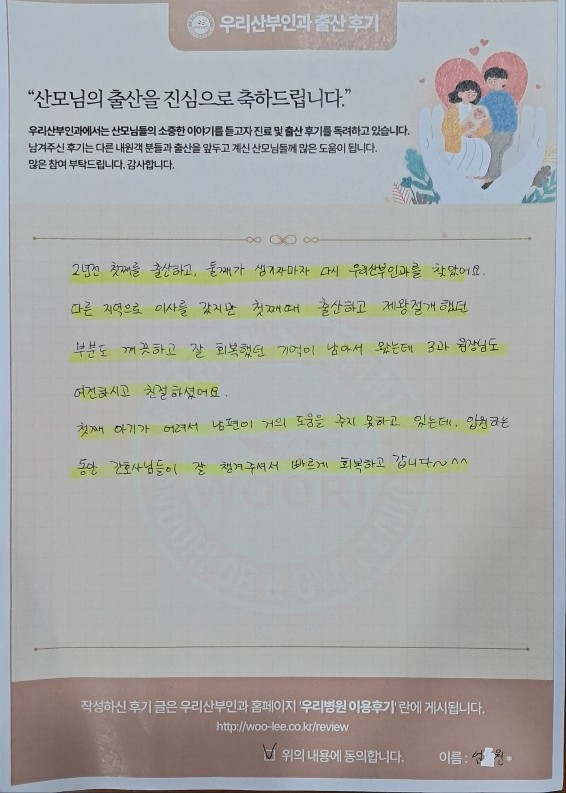 2년전 첫째를 출산하고, 둘째가 생기자마자 다시 우리산부인과를 찾았어요.
