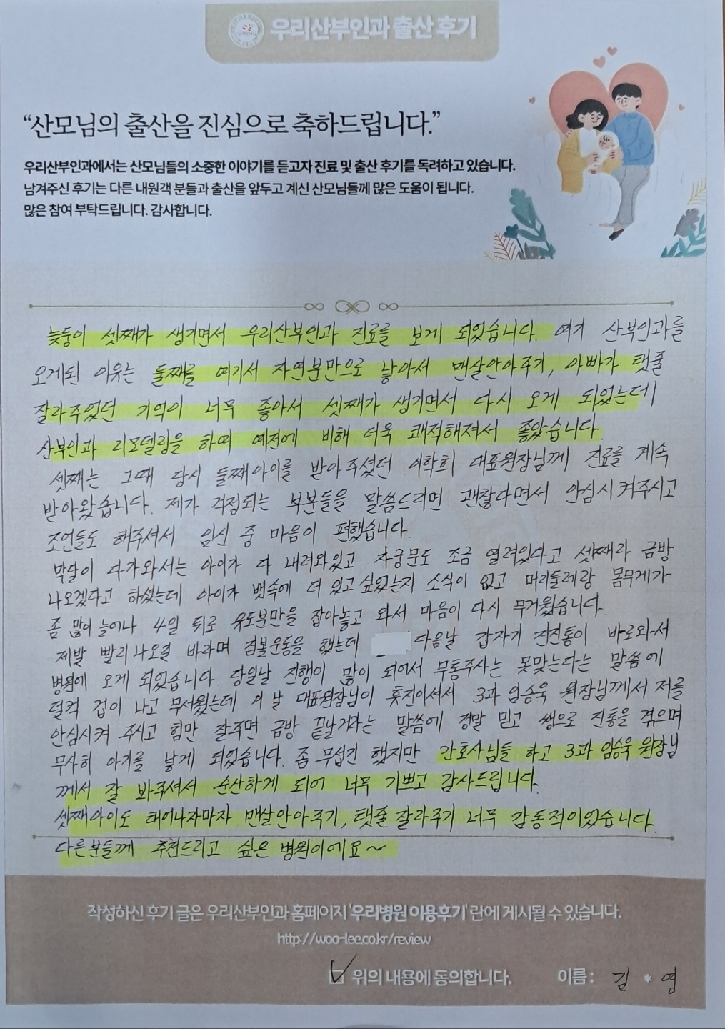 당일날 진행이 많이 되어서 무통주사는 못맞는다는 말씀에 덜컥 겁이나고 무서웠는데 이날 대표원장님이 휴진이셔서 3과 임승욱 원장님께서 저를 안심시켜주시고 힘만 잘주면 금방 끝날거라는 말씀에 정말 믿고 쌩으로 진통을 겪으며 무사히 아기를 낳게 되었습니다.