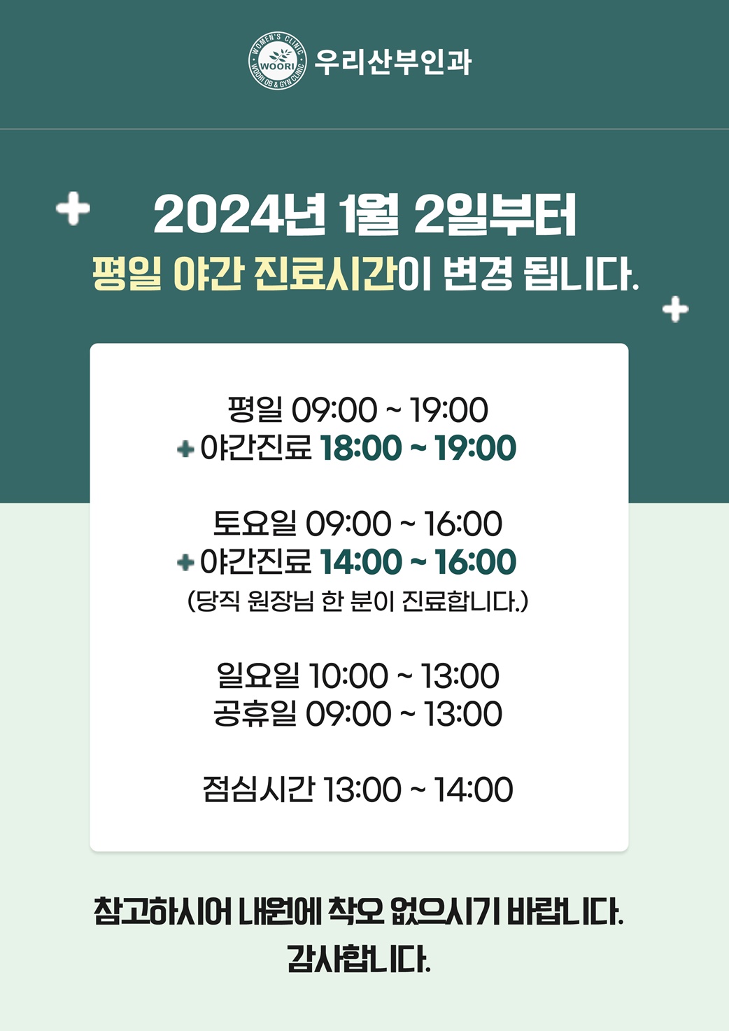 2024년 1월 2일부터 평일 야간진료 시간이 변경 됩니다.