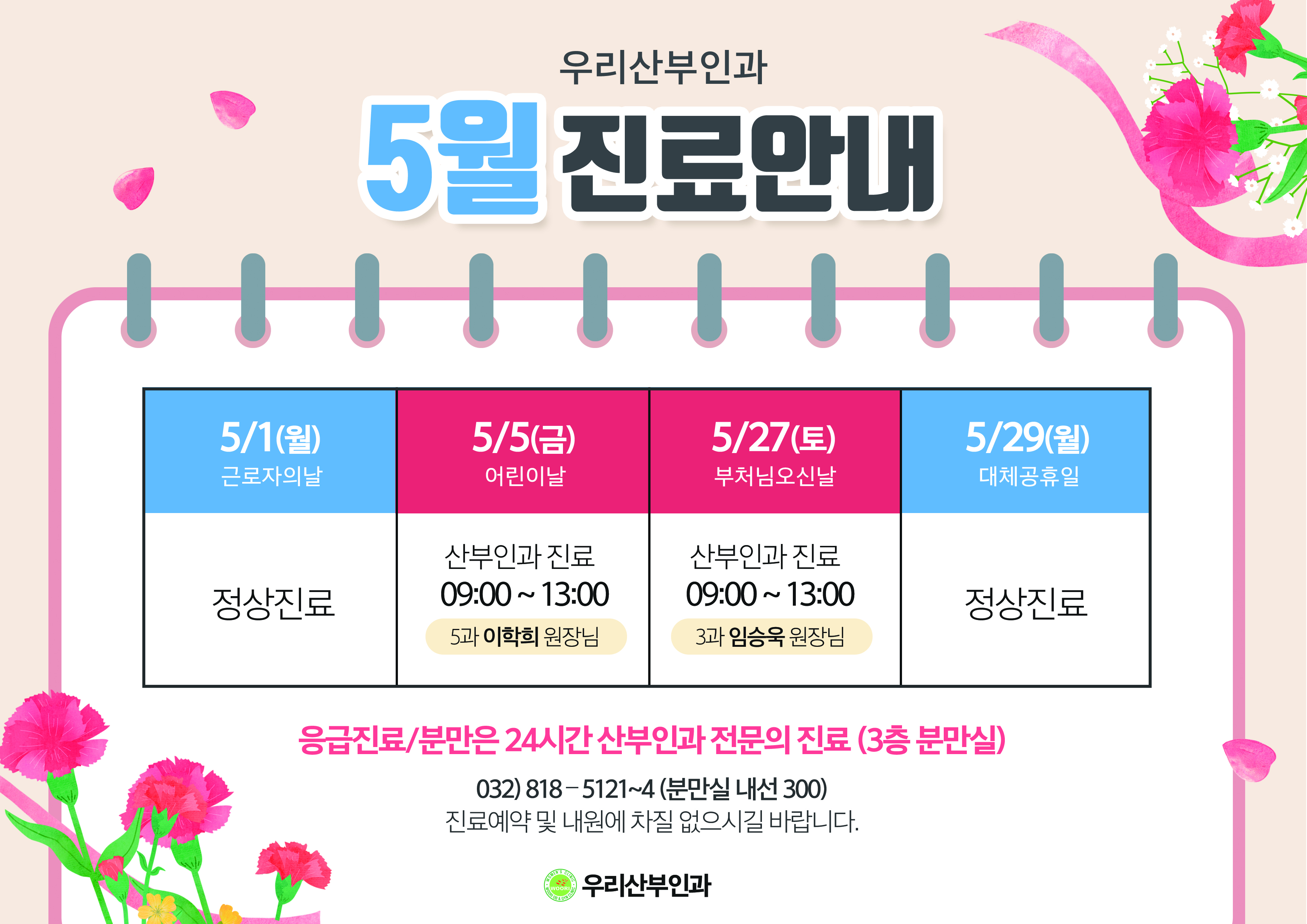 5월5일 어린이날은 오전9시~오후1시 5과 이학희 원장님 진료