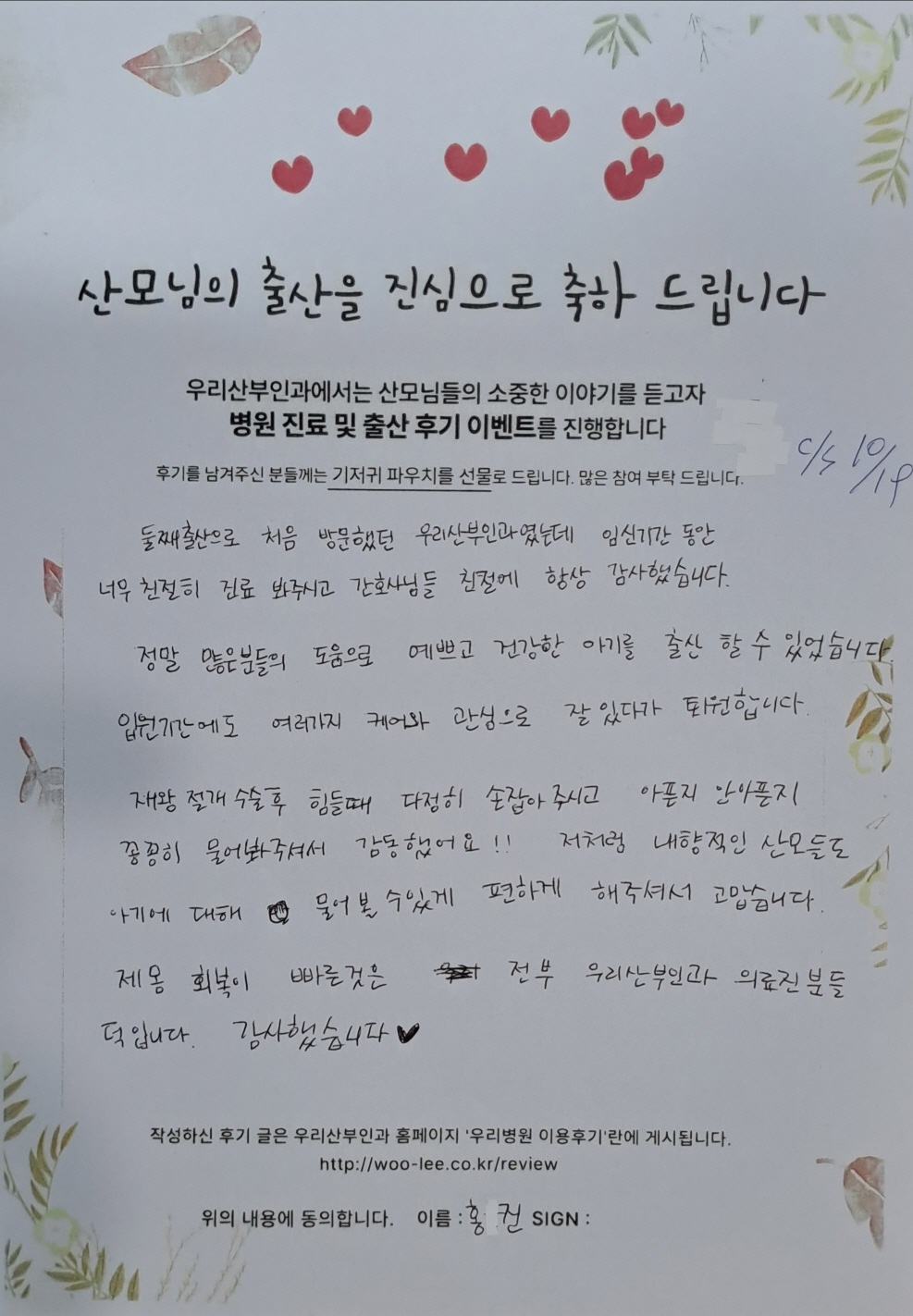 제 몸 회복이 빠른 것은 전부 우리산부인과 의료진분들 덕입니다.