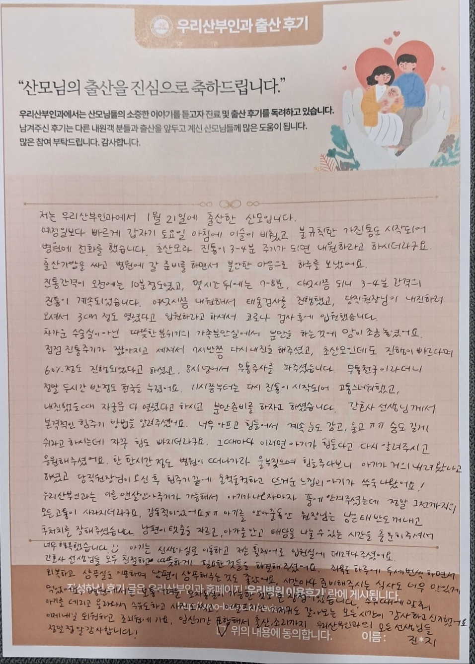 저는 우리산부인과에서 1월 21일에 출산한 산모입니다.