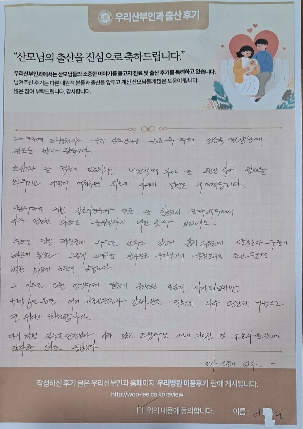 원무과에 계신 간호사분들과 또한 늘 친절하게 응대해주셔서 아주 편안한 마음으로 출산일까지 내원할 수 있었어요.