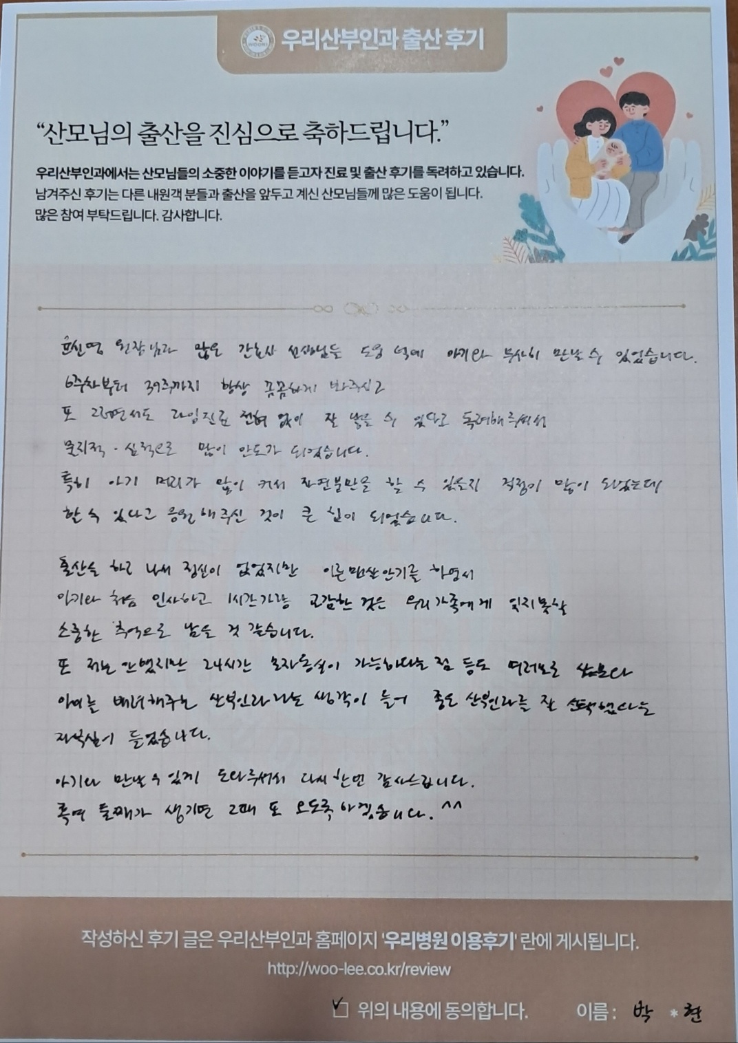 특히 아기 머리가 많이 커서 자연분만을 할수 있을지 걱정이 많이 되었는데 할 수 있다고 응원해주신 것이 큰 힘이 되었습니다.