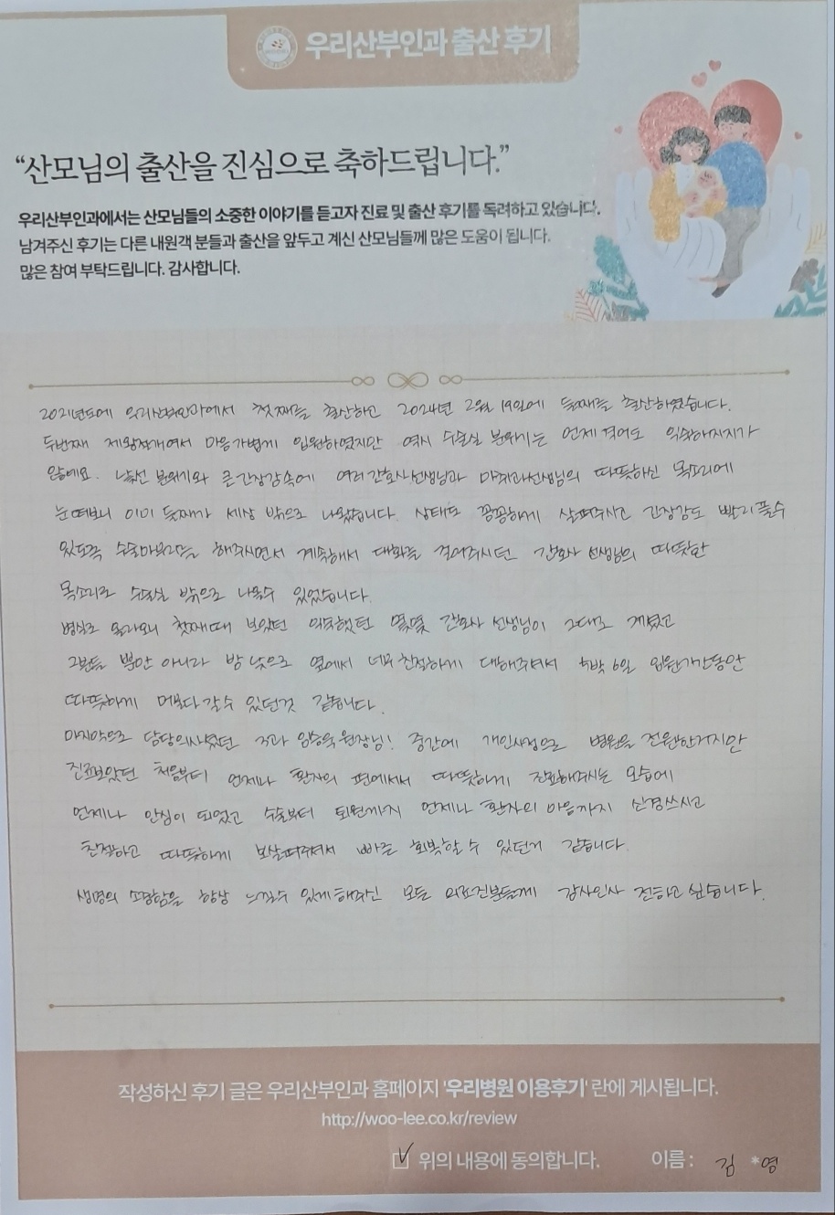 2021년도에 우리산부인과에서 첫째를 출산하고 2024년 2월 19일에 둘째를 출산하였습니다.