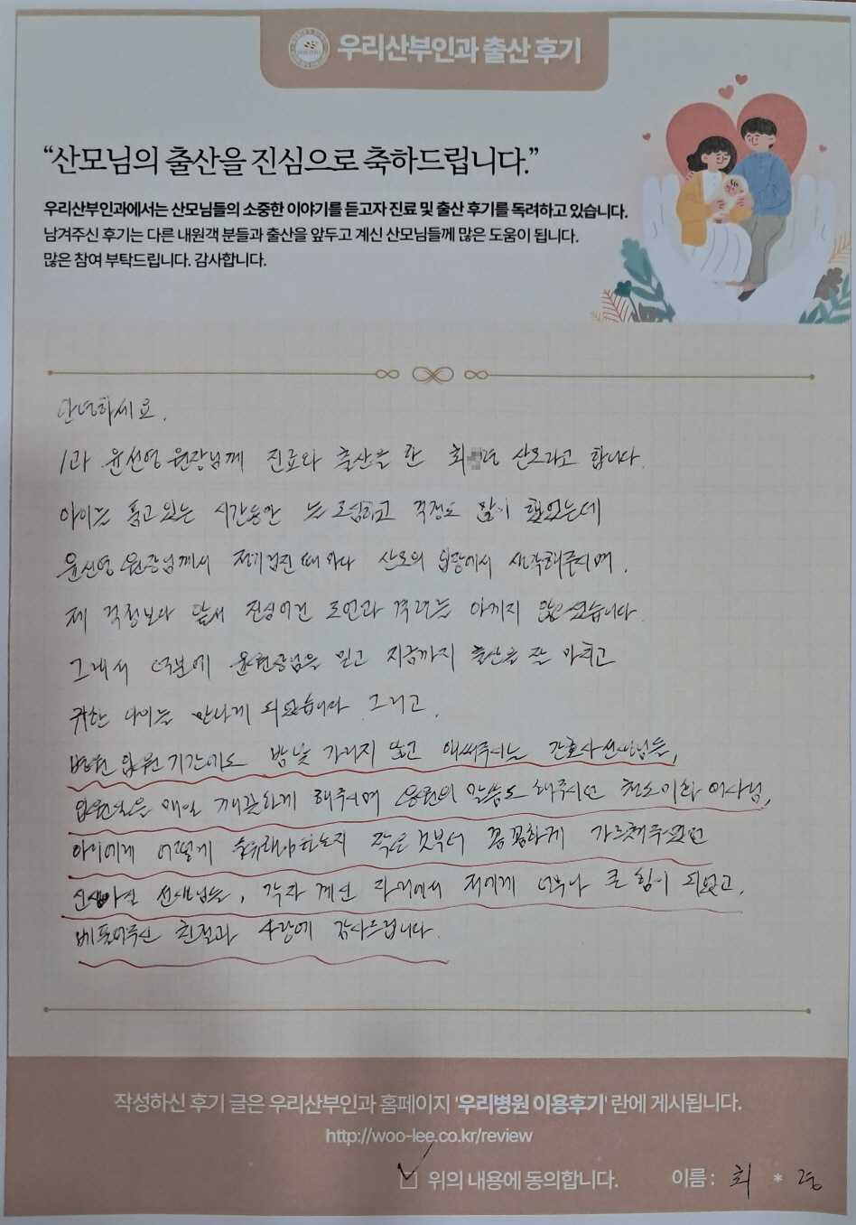 1과 윤선영 원장님께 진료와 출산을 한 최*령 산모라고 합니다.