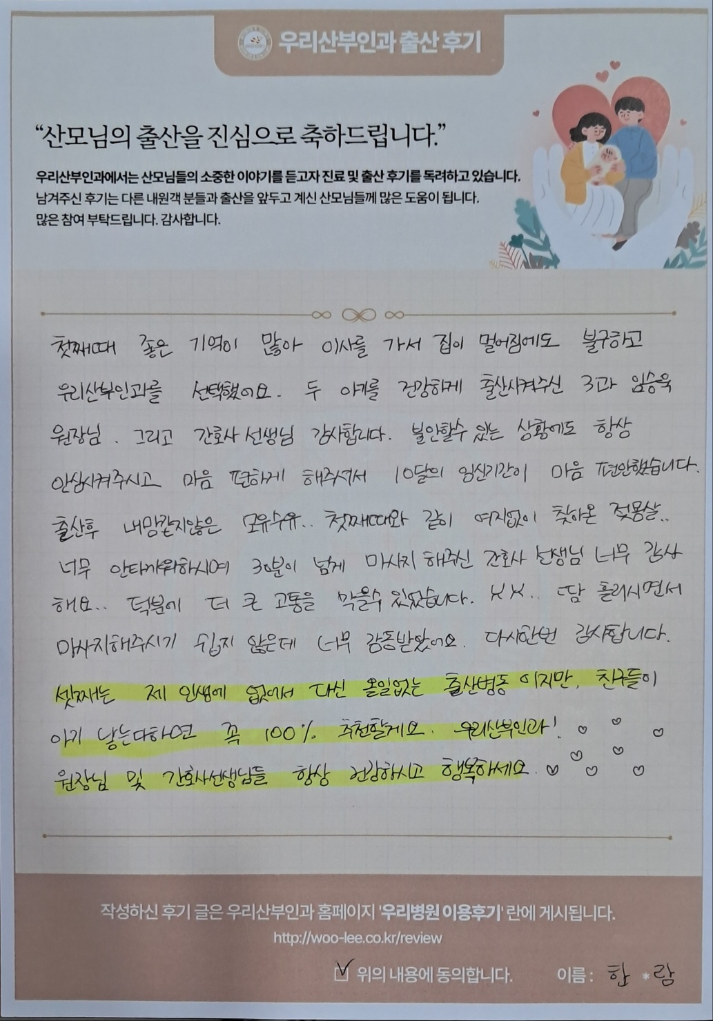 첫째때 좋은 기억이 많아 이사를 가서 집이 멀어짐에도불구하고 우리산부인과를 선택했어요.