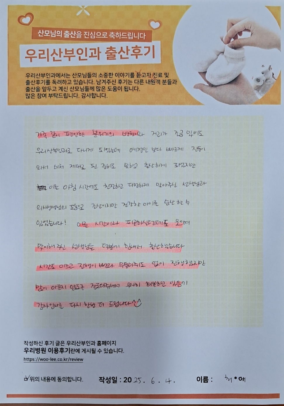 가족같이 편안한 분위기 병원이라 거리가 조금 있어도 우리산부인과로 다니게 되었는데 예정일 보다 빠르게 진통이 와서 미처 제대로된 준비도 못하고 출산하게 되었지만 이른 아침 시간에도 친절하고 다정하게 맞아주신 선생님과 의사선생님의 도움으로 조산이지만 건강한 아이를 순산할 수 있었습니다.