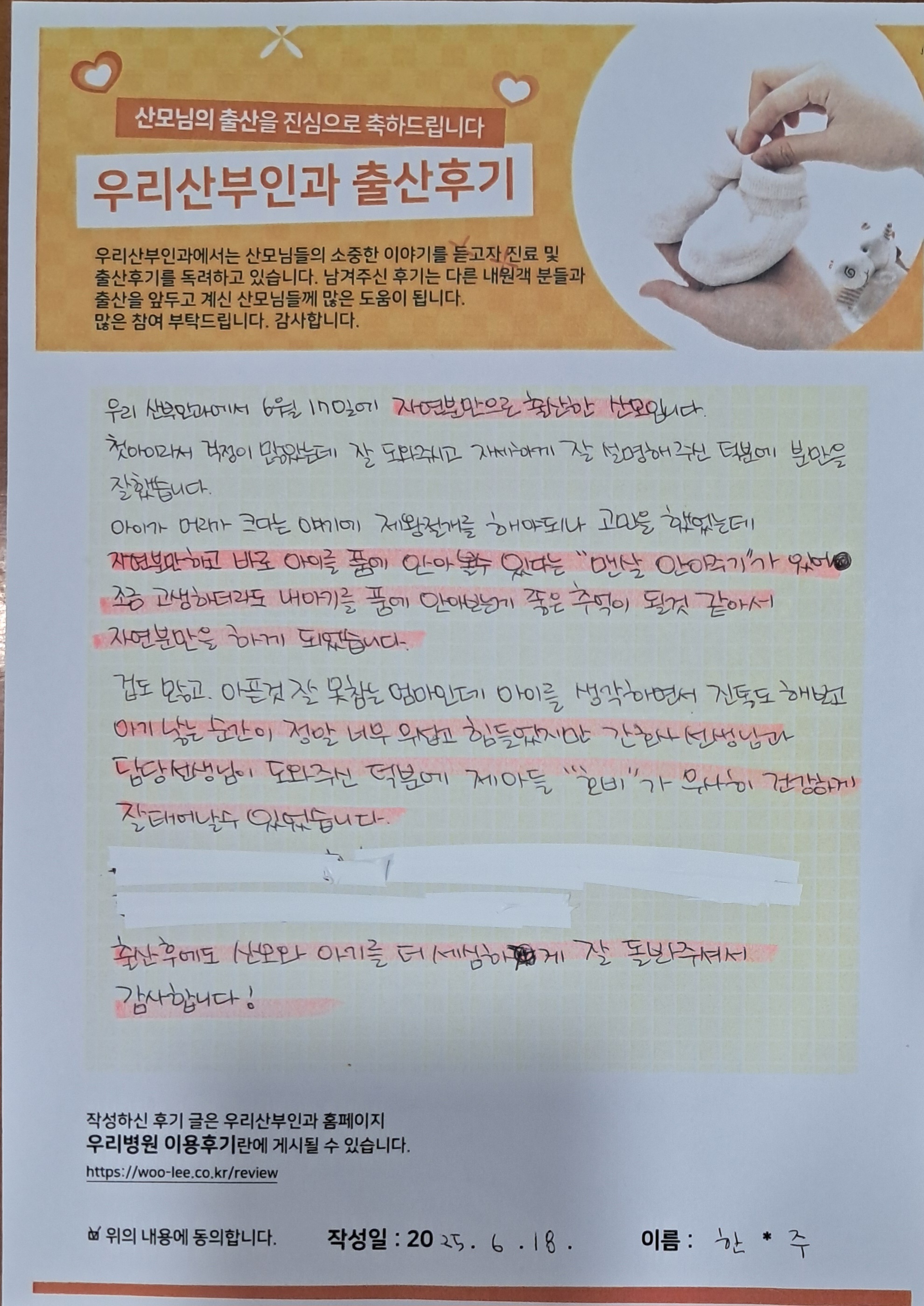 우리산부인과에서 6월17일에 자연분만으로 출산한 산모입니다.