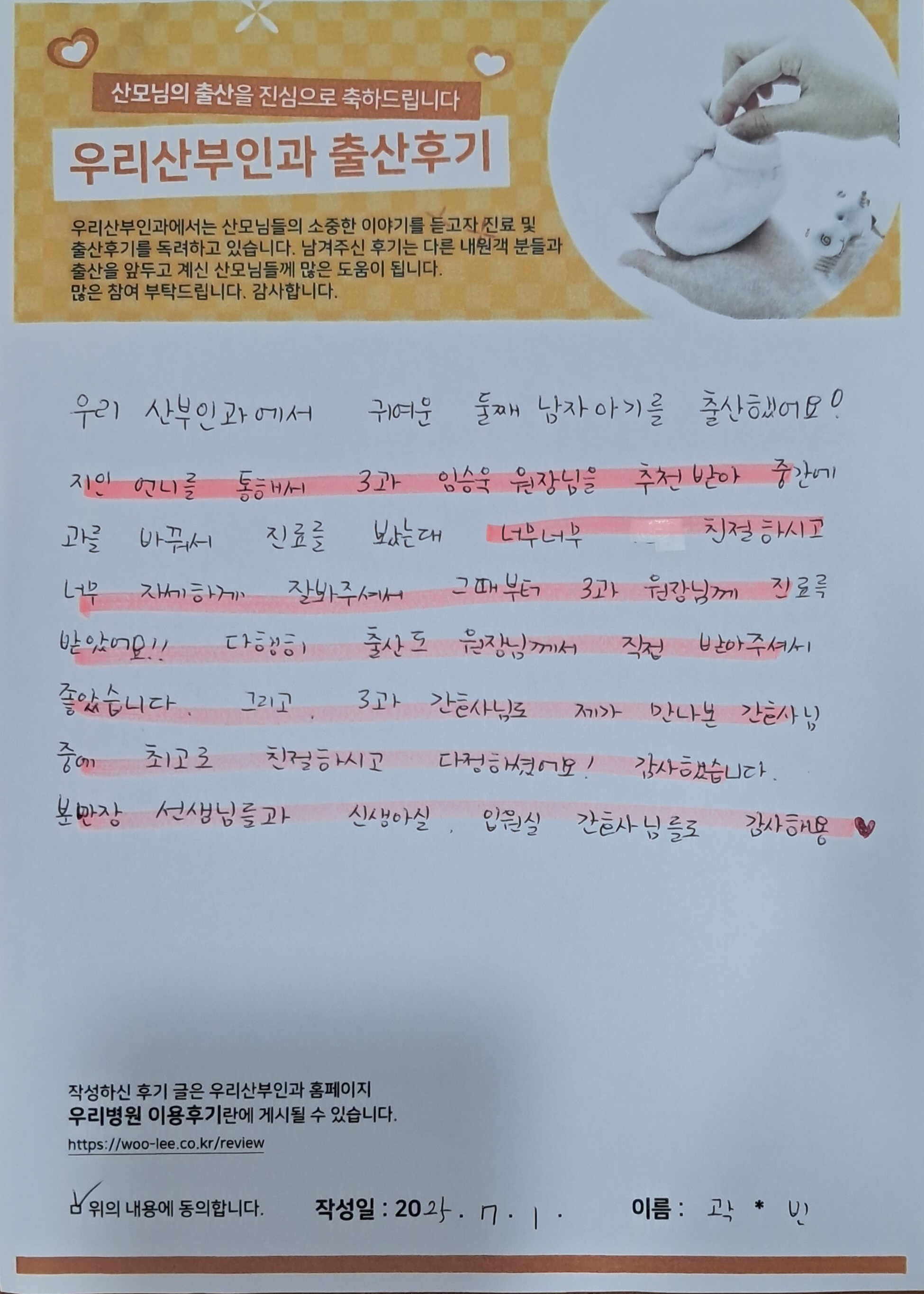곽*빈 산모님 출산후기 - 우리산부인과에서 귀여운 둘째 남자아기를 출산했어요!