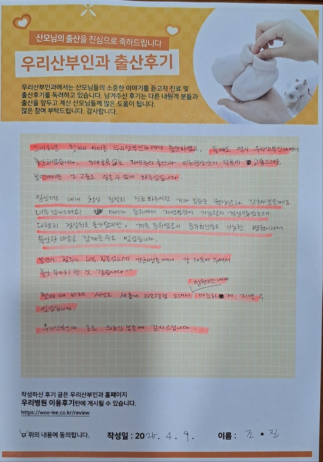 2018년 첫재 아이를 우리산부인과에서 출산하였고, 둘째도 역시 우리산부인과에서 출산하였습니다.
