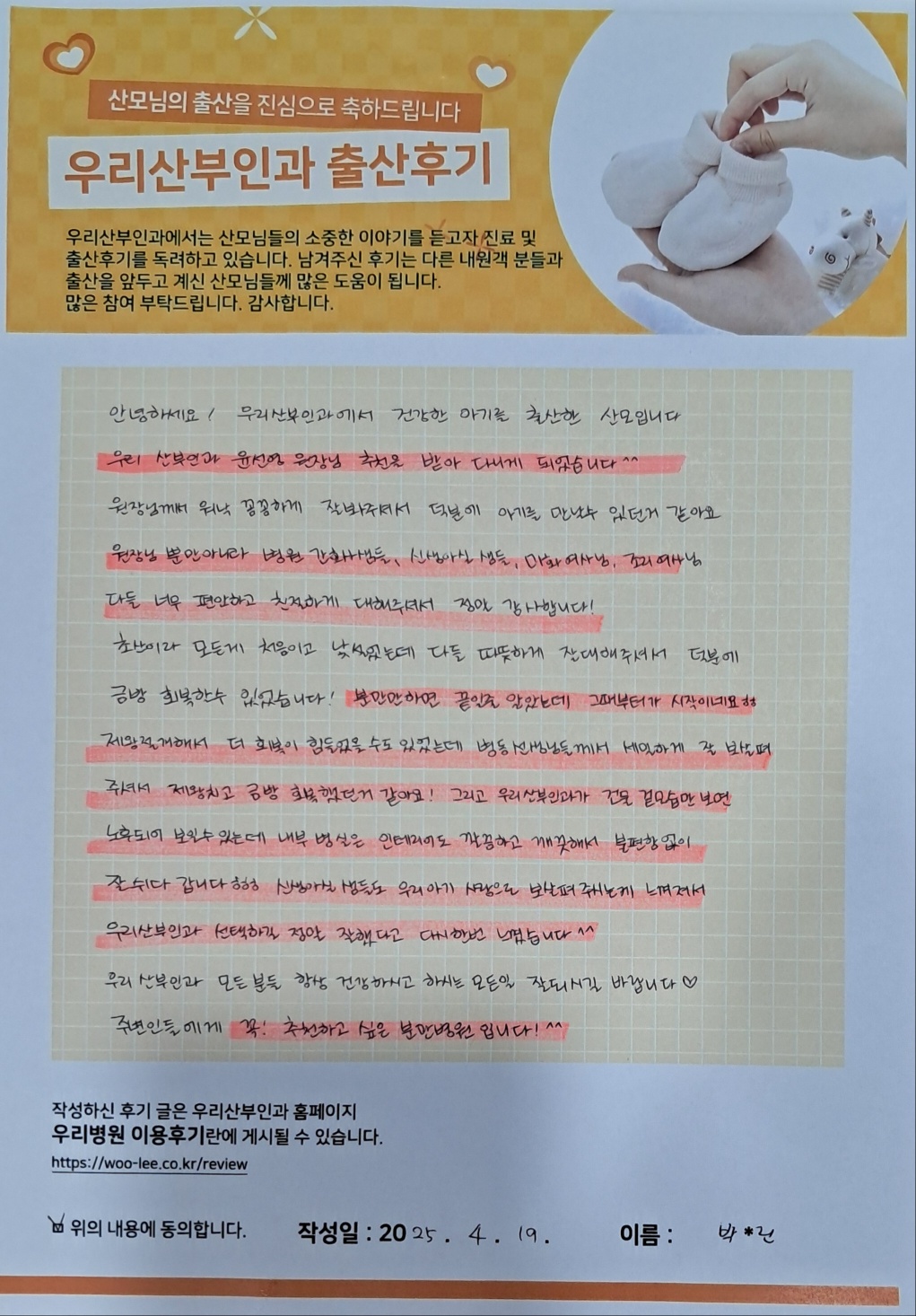 안녕하세요 우리산부인과에서 건강한 아기를 출산한 산모입니다.