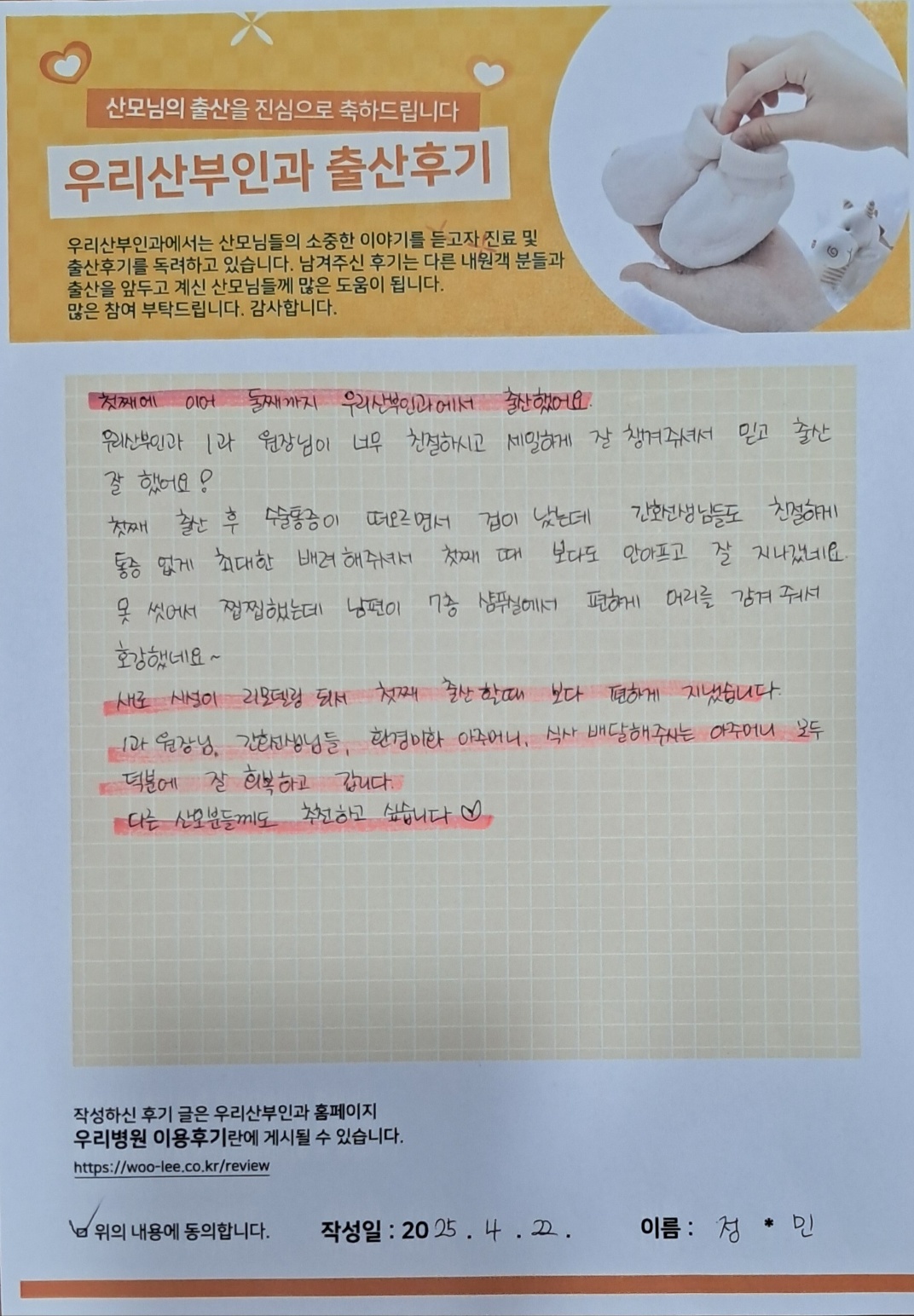 첫째에 이어 둘째까지 우리산부인과에서 출산했어요.