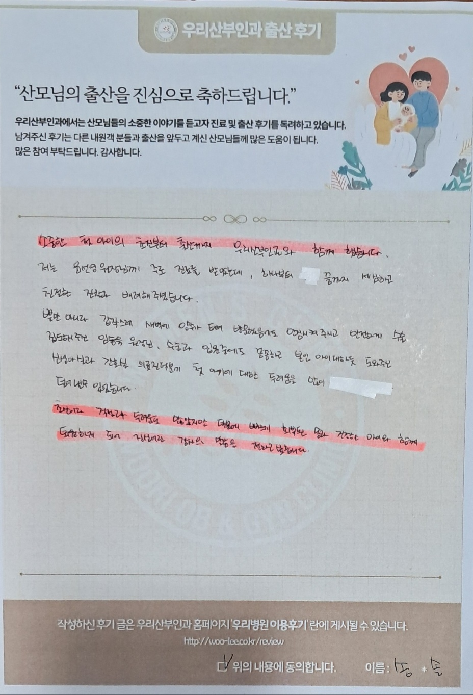 송*솔 산모님 출산후기 - 소중한 첫 아이의 초산부터 출산까지 우리산부인과와 함께했습니다.