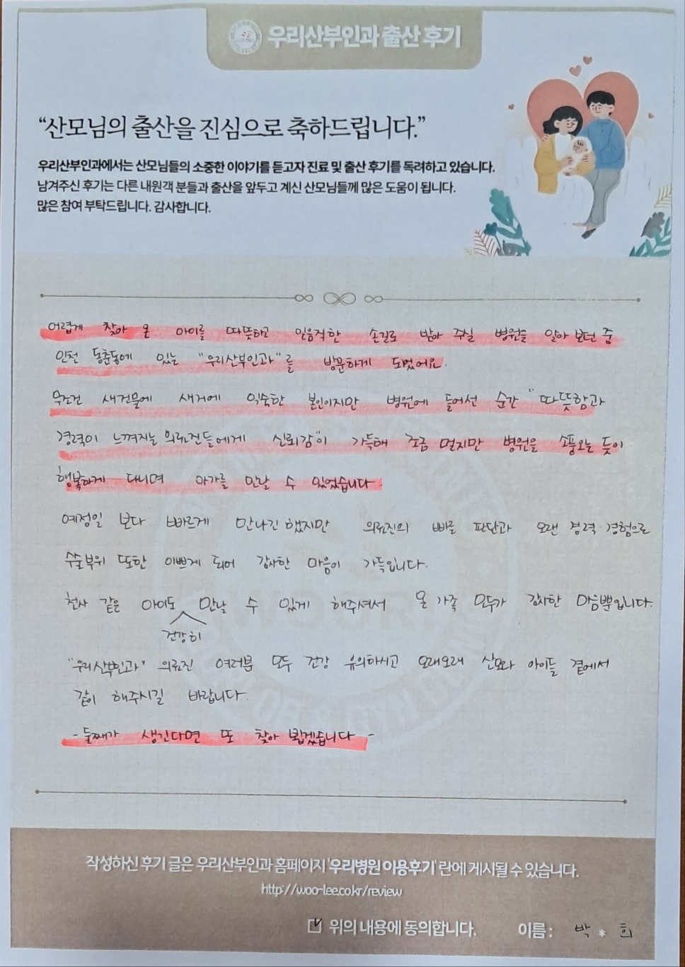 박*희 산모님 출산후기 - 어렵게 찾아 온 아이를 따뜻하고 믿음직한 손길로 받아줄 곳을 찾다가 알게된 우리산부인과.