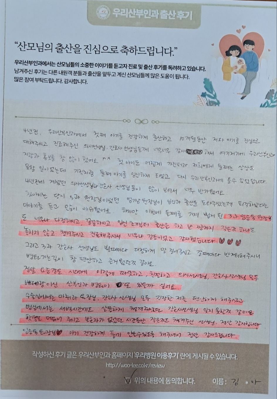 4년전, 우리산부인과에서 첫째 아기를 건강하게 출산하고 10개월동안 저와 아기를 진심으로 대해주시고 진료해주신 의사선생님, 간호사선생님들께 너무너무 감사해서 여기저기에 우리산부인과 자랑과 홍보를 참 많이 했어요^^ 첫 아이도 어렵게 가진터라 저희에게 둘째는 상상도 못할 일이었는데 기적처럼 둘째 아기를 임신하게 되었고 다시 우리산부인과에 올 수 있었답니다.