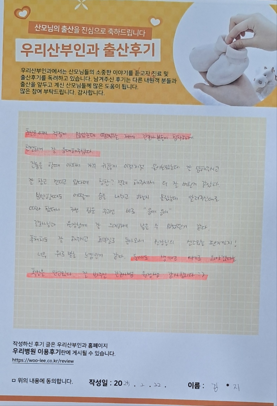 진통을 할 때 아파서 자꾸 귀찮게 이것저것 물어보았는데 잘 답해주시고 잘 참고 견디고 있따며 칭찬? 격려해주셔서 더 잘 버틴거 같았다. 분만할때도 어떻게 숨을 내쉬고 하는지 몰랐는데 알려주신대로 따라했더니 3번 힘을 주고서 바로 "응애응애" 간호사님과 원장님께 잘 의지하며 낳을 수 있었떤 거 같다.