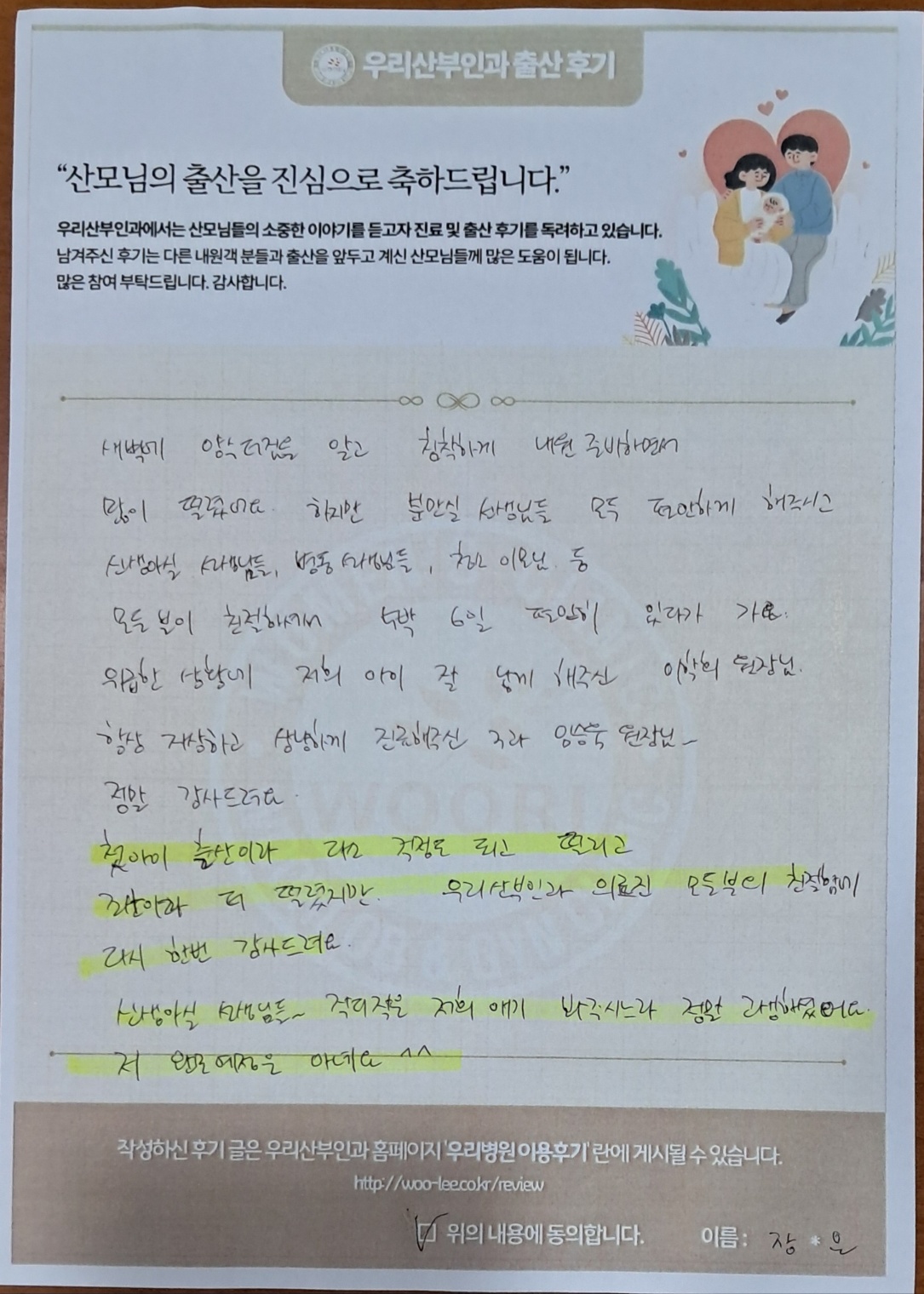 첫아이 출산이라 다소 걱정도 되고 떨리고 조산이라 더 떨렸지만 우리산부인과 의료진 모든분의 친절함에 다시 한번 감사드려요.