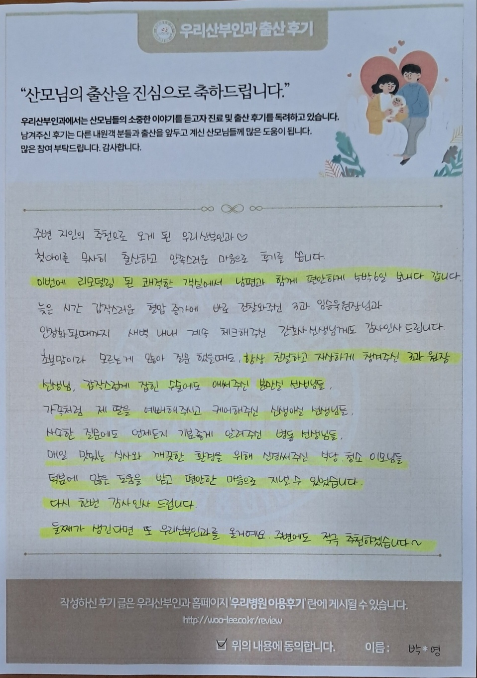 둘째가 생긴다면 또 우리산부인과를 올거에요. 주변에도 적극 추천하겠습니다~