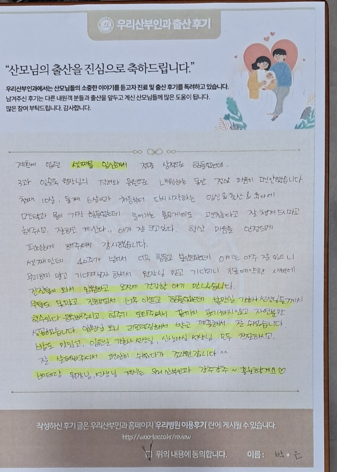 셋째인데 40주가 넘어서 너무 힘들고 불안했는데 아기는 아주 잘 있으니 무리하지 말고 기다려보자 하셔서 원장님 믿고 기다리니 진료 예약한 새벽에 진진통이 와서 입원하고 오전에 건강한 아기 만났습니다.