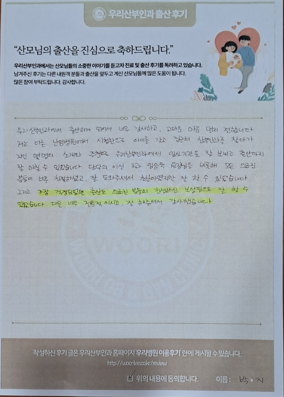 우리산부인과에서 출산하게 되어서 너무 감사하고, 고마운 마음 먼저 전합니다. 저는 다른 난임병원에서 시험관으로 아이를 갖고 집근처 산부인과를 찾다가 지인 몇명의 소개와 추천으로 우리산부인과에서 임신기간을 잘 보내고 출산까지 잘 마칠 수있었습니다.