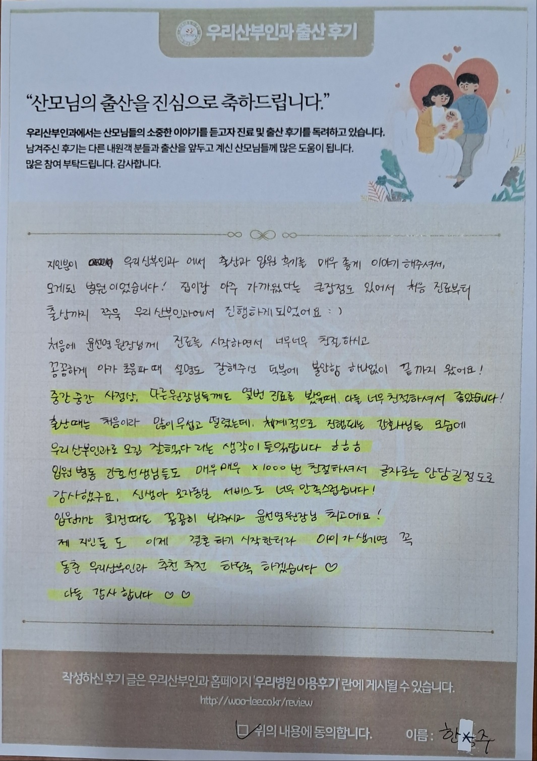 한*주 출산후기 - 지인분이 우리산부인과에서 출산과 입원후기를 매우 좋게 이야기해주셔서, 오게된 병원입니다.