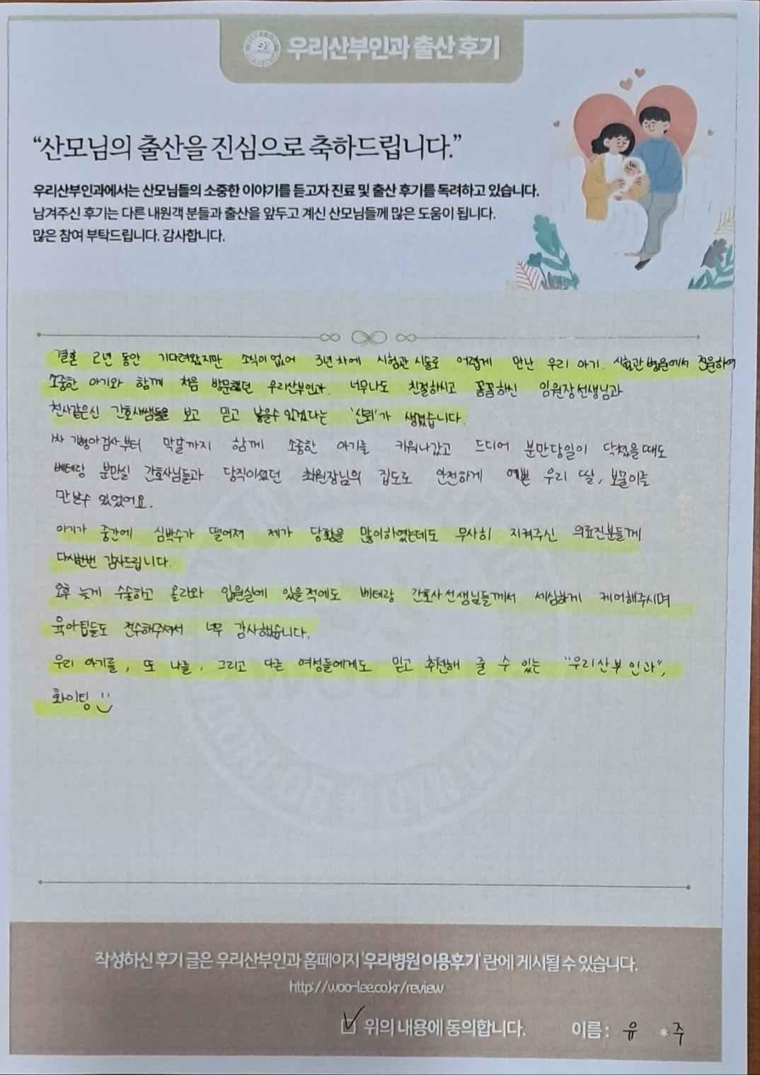 우리 아기를, 또 나를, 그디로 다른 여성들에게도 믿고 추천해 줄 수 있는 "우리산부인과" 화이팅 :)