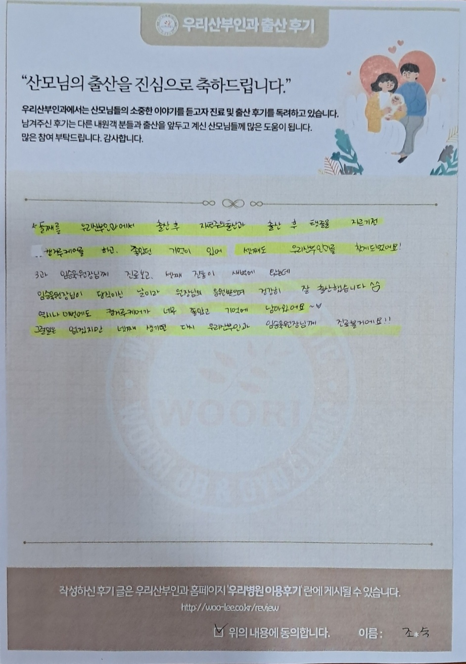 둘째를 우리산부인과에서 출산후 자연주의출산과 출산 후 탯줄을 자르기전 캥거루케어를 하고, 좋았던 기억이 있어 셋째도 우리산부인과를 찾게 되었어요.