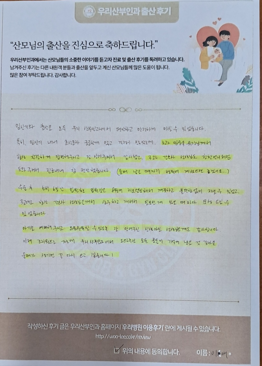 임신기와 출산을 모두 우리산부인과에서 편안하고 안전하게 마칠 수 있었습니다.