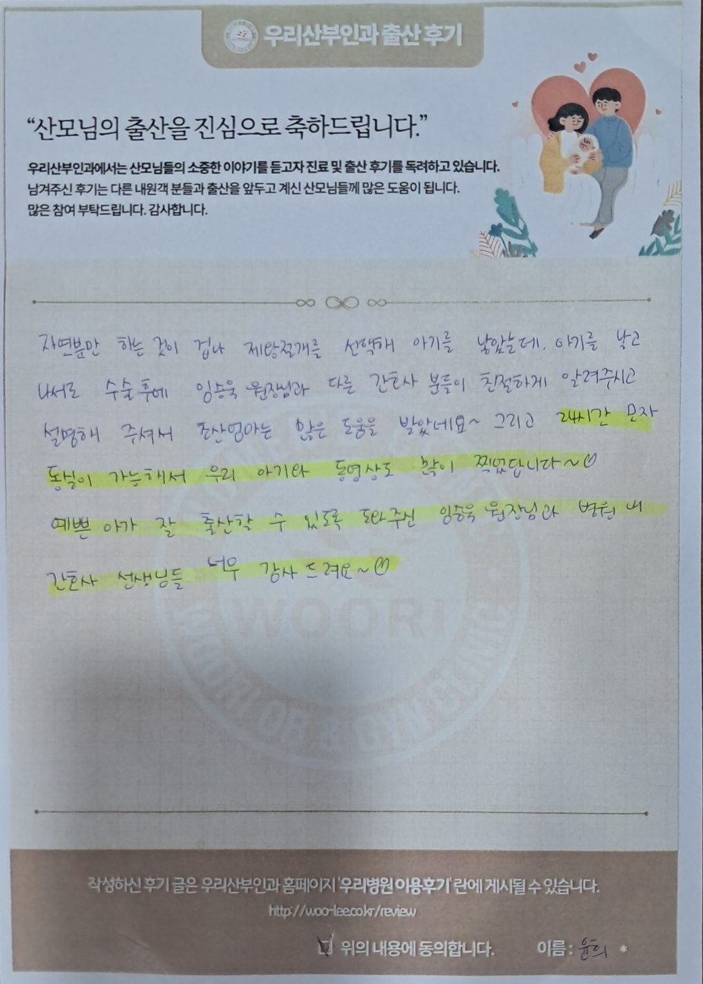 윤희* 산모님 출산후기 - 우리산부인과에서 초산엄마는 많은 도움을 받았네요^^