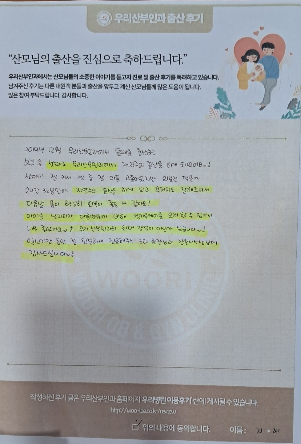 2019년 12월 우리산부인과에서 둘째를 출산하고 5년 후 셋째도 우리산부인과에서 자연주의 출산을 하게 되었어요~!