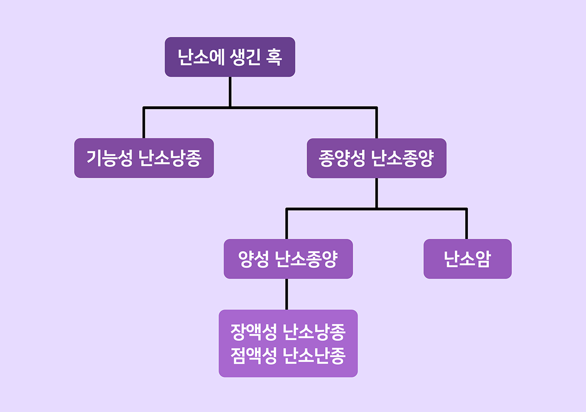 난소 종양이란 난소에 생긴 혹을 말합니다. 그림을 보시는 것처럼 기능성 난소종양, 종양성 난소종양으로 구분됩니다.