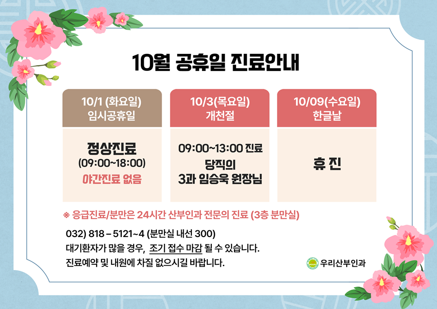 10월3일 개천절 (목) 오전9시~오후1시 진료 (당직의 3과 임승욱 원장님)