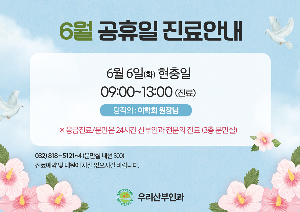 6월6일 (화) 현충일 09:00~13:00 (진료) 합니다.