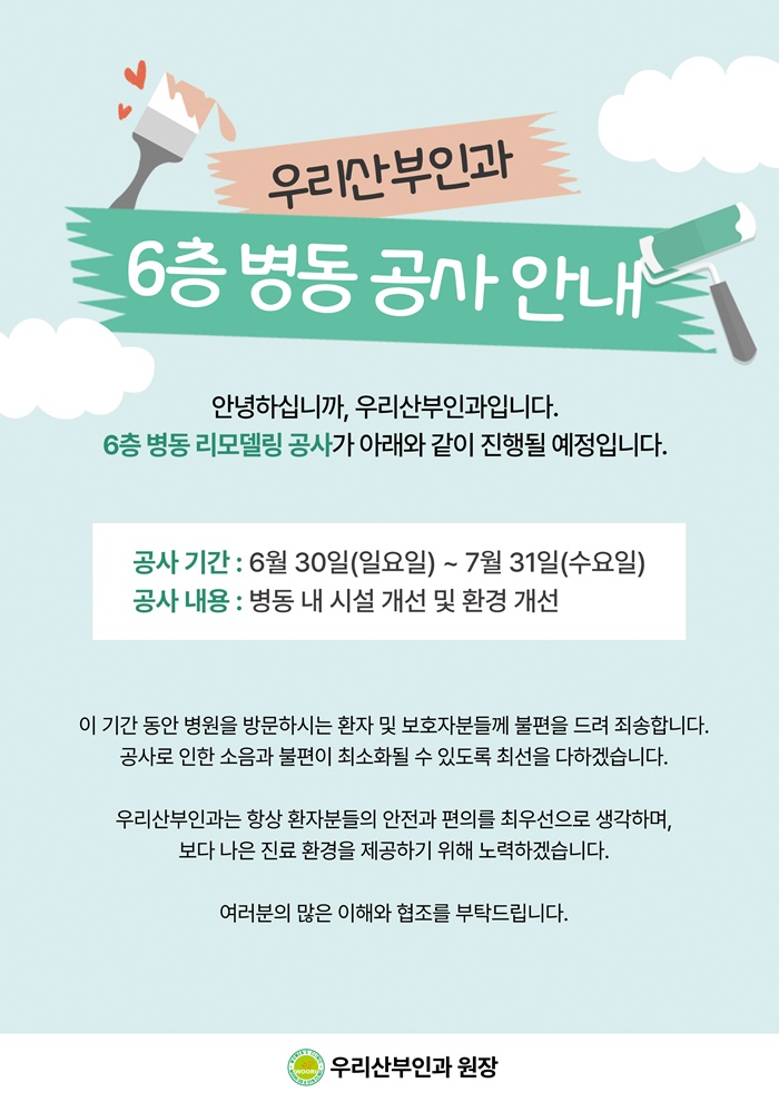 이 기간 동안 병원을 방문하시는 환자 및 보호자분들께 불편을 드려 죄송합니다. 공사로 인한 소음과 불편이 최소화될 수 있도록 최선을 다하겠습니다.
