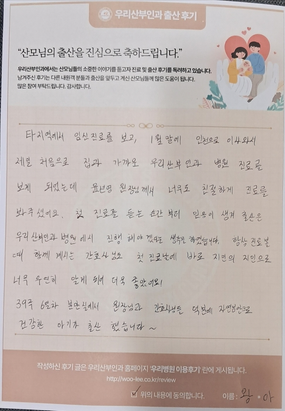 첫 진료를 듣는 순간부터 믿음이 생겨 출산은 우리산부인과 병원에서 진행해야겠다는 생각을 하였습니다.