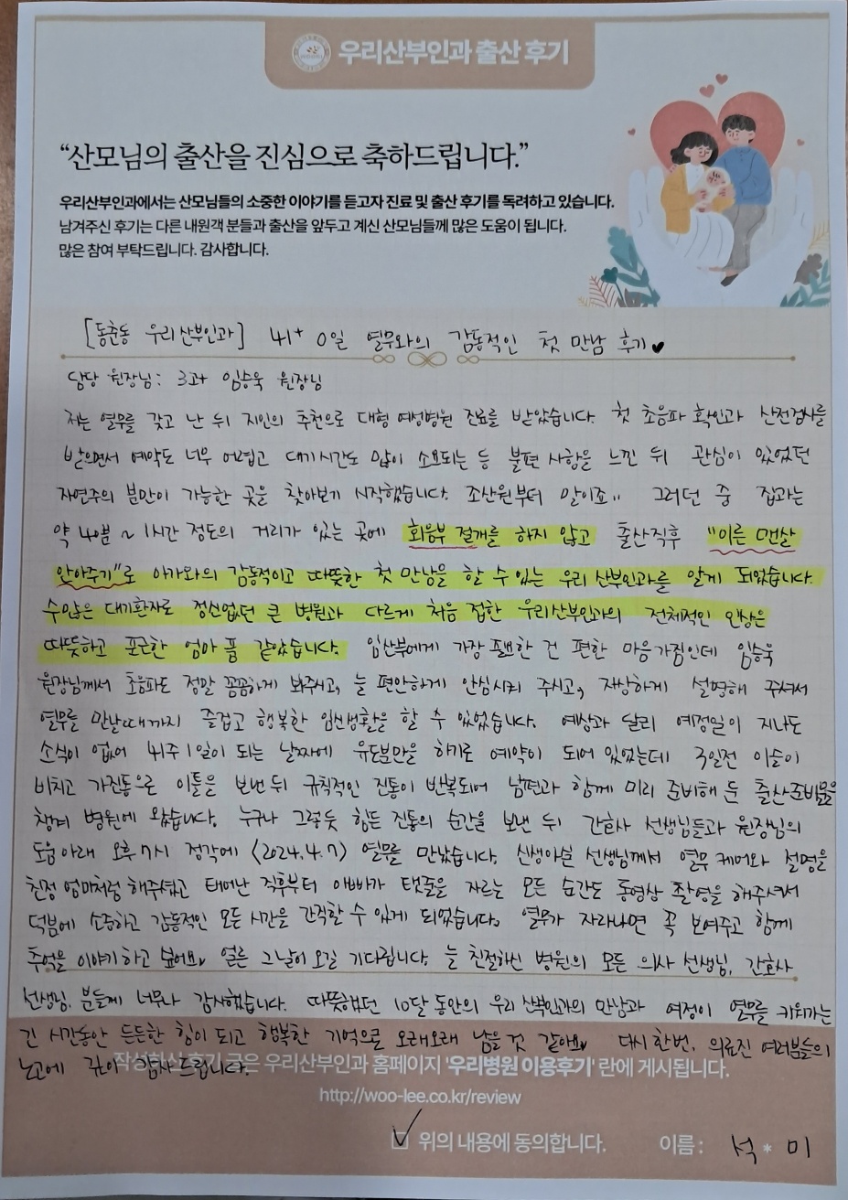 출산 직후 "이른맨살안아주기"로 아기와의 감동적이고 따뜻한 첫 만남을 할 수 있는 우리산부인과를 알게 되었습니다.