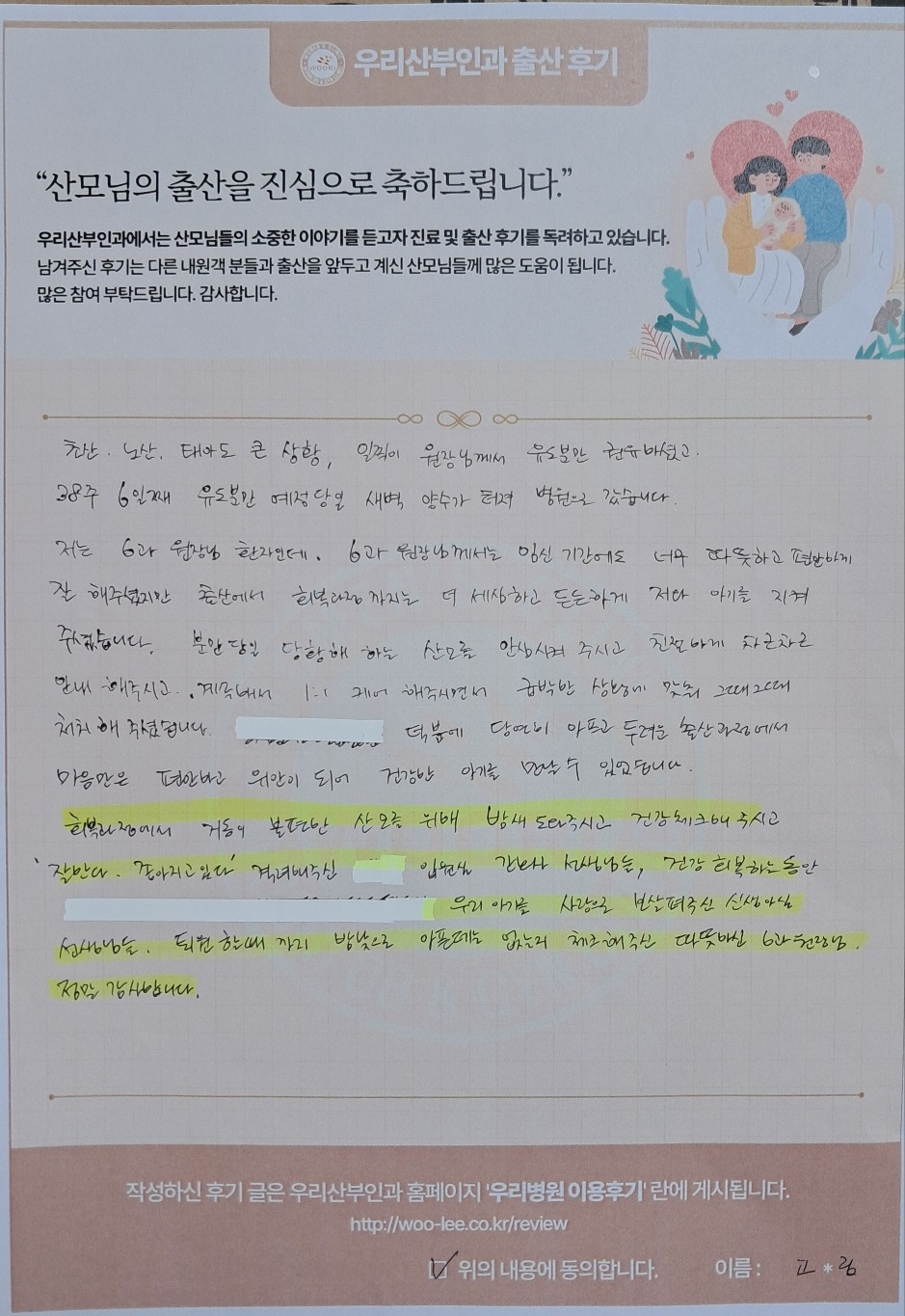 회복과정에서 거동이 불편한 산모를 위해 밤새 도와주시고 건강체크해주시고 '잘한다, 좋아지고 있다' 격려해주신 입원실 간호사 선생님들, 건강 회복하는 동안 우리 아기를 사랑으로 보살펴주신 신생아실 선생님들, 퇴원할때까지 밤낮으로 아픈데는 없는지 체크해주신 따뜻하신 6과 원장님, 정말 감사합니다.