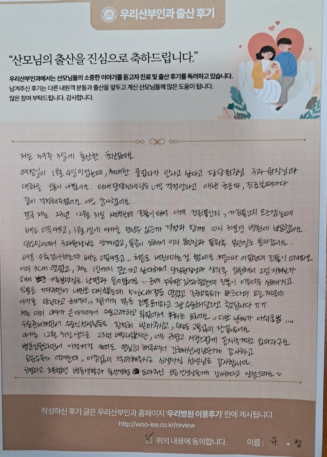 결국 저는 23년 12월 31일 새벽부터 진통이 와서 이게 진진통인지, 가진통인지 모르겠는데 배는 너무 아프고, 1월1일에 아가를 만날 수 있을까 걱정과 함께 10시 30분경 병원에 방문했어요.