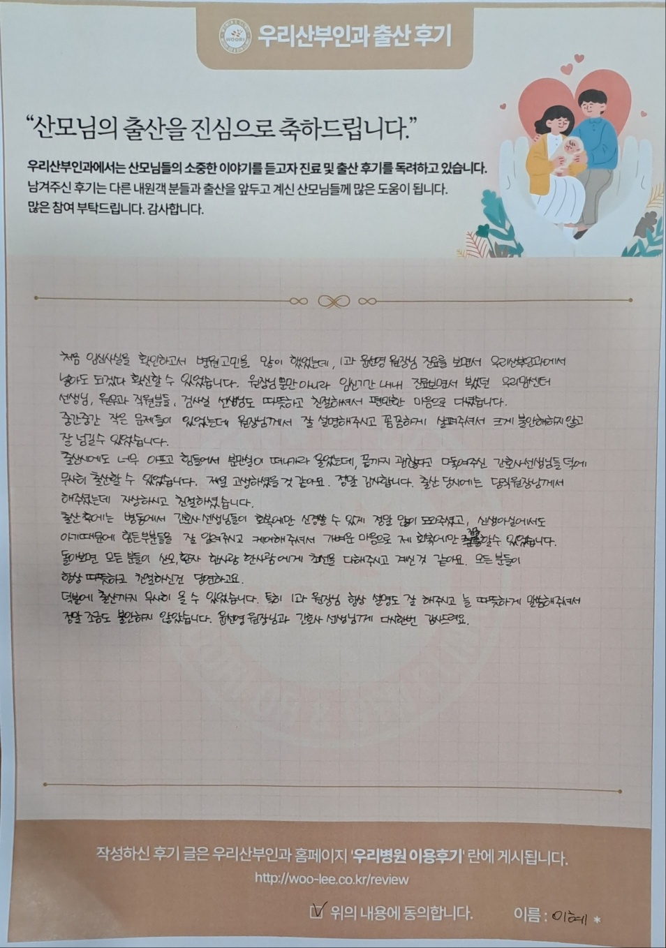 1과 윤선영 원장님 진료를 보면서 우리산부인과에서 낳아도 되겠다 확신할 수 있었습니다.