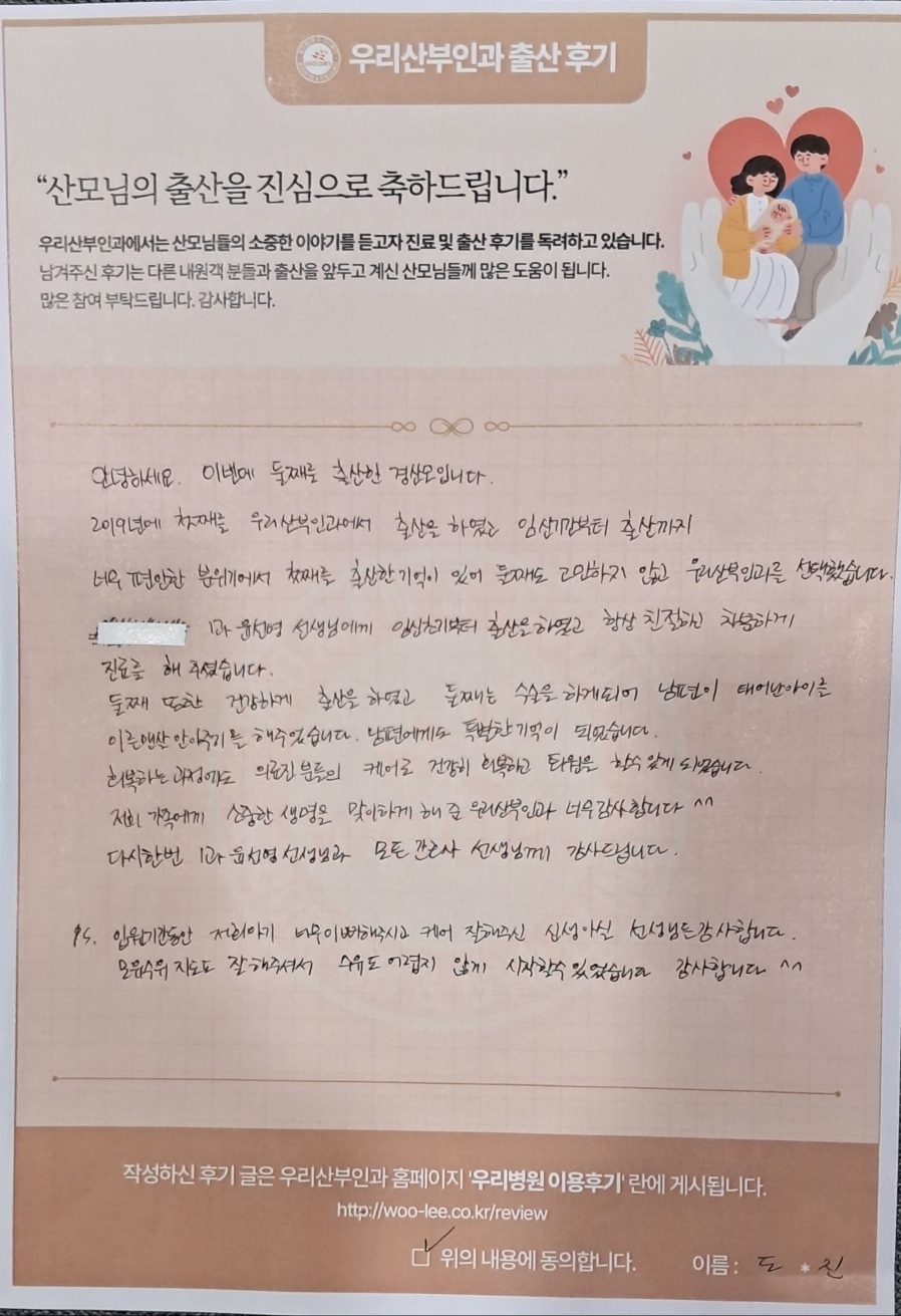 2019년에 첫째를 우리산부인과에서 출산을 하였고 임신기간부터 출산까지 너무 편안한 분위기에서 첫째를 출산한 기억이 있어 둘째도 고민하지 않고 우리산부인과를 선택했습니다.