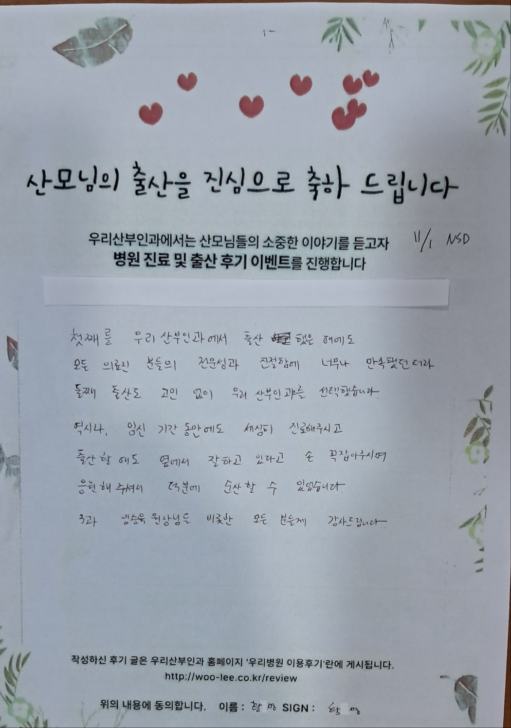 둘째 출산도 고민 없이 우리산부인과를 선택했습니다.