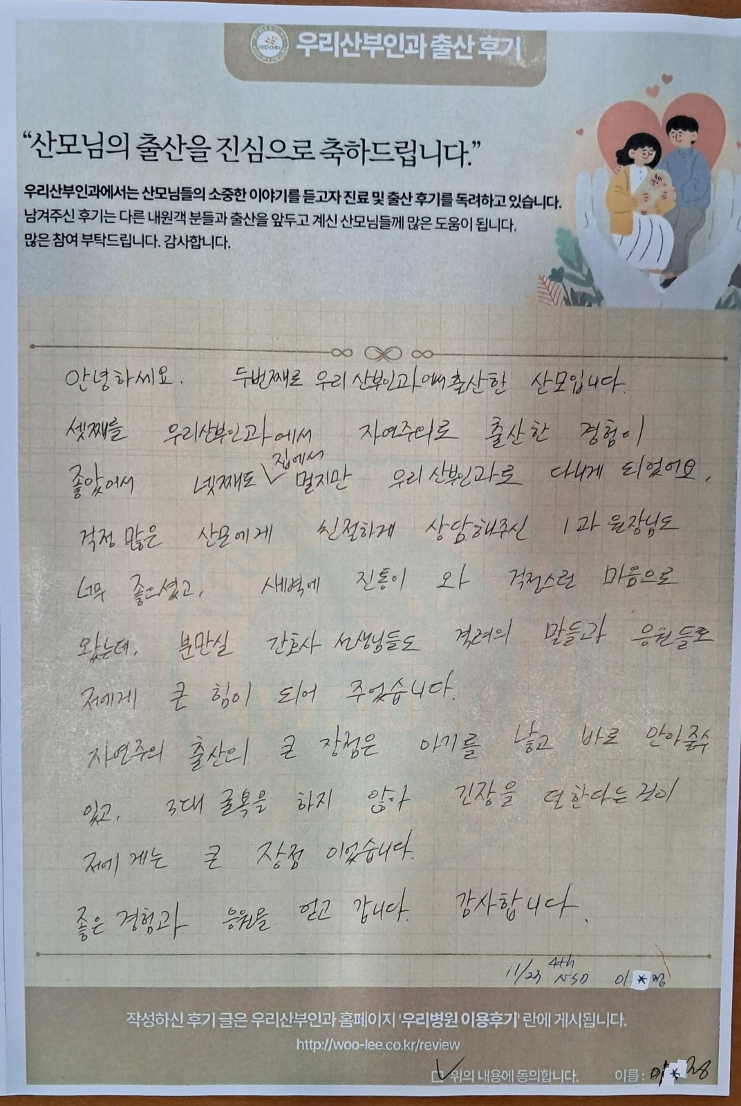 셋째를 우리산부인과에서 자연주의로 출산한 경험이 좋았어서