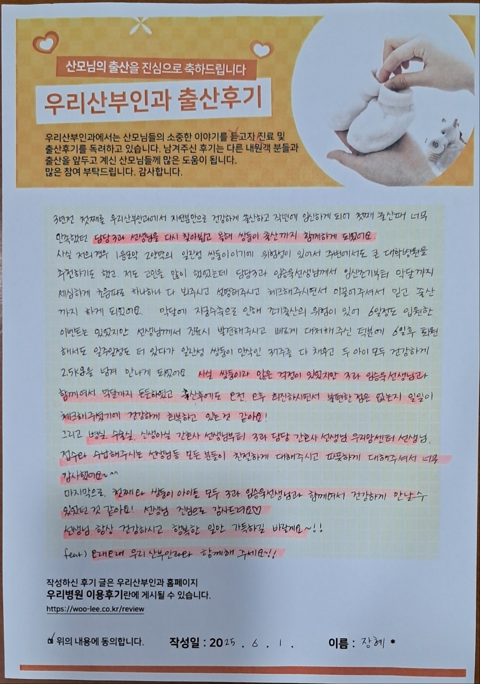 장*혜 산모님 출산후기 - 오래오래 우리산부인과 함께해주세요!