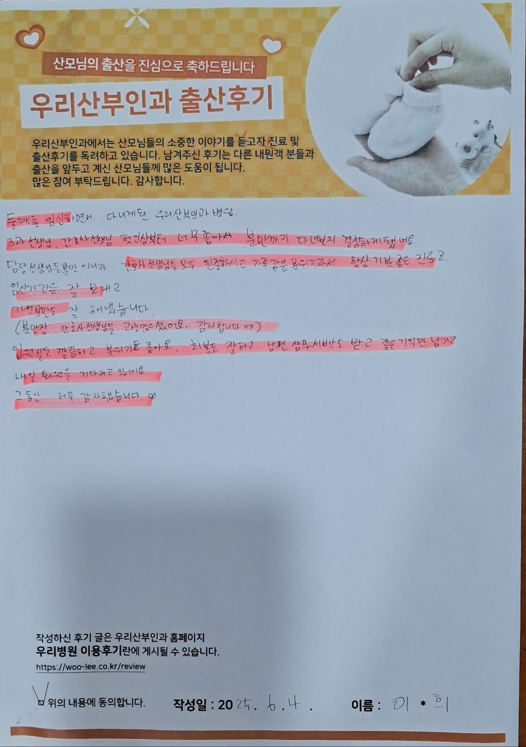 담당선생님들뿐만 아니라 간호사 선생님들 모두 친절하시고 가족같은 분위기라서 항상 기분좋은 진료로 임신 기간을 잘 보내고 자연분만도 잘 해냈습니다.