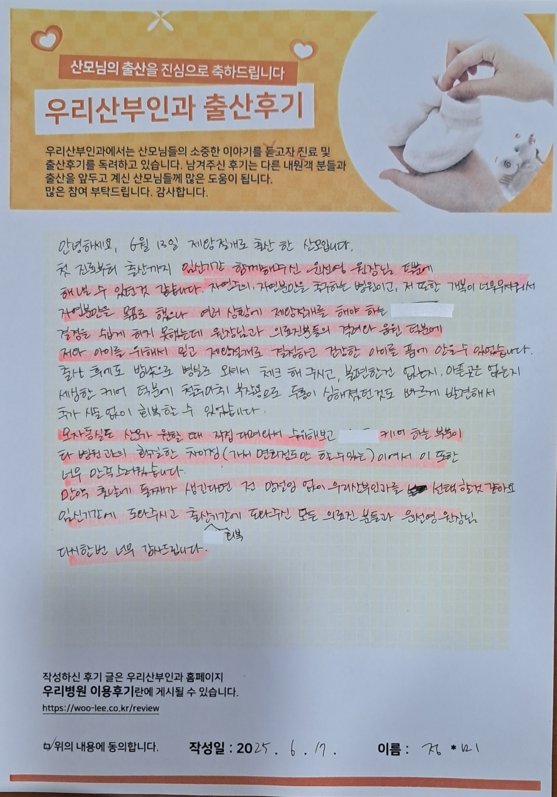 정*미 산모님 출산후기 - 만약에 훗날 둘째가 생긴다면 전 망설임 없이 우리산부인과를 선택할 것 같아요.